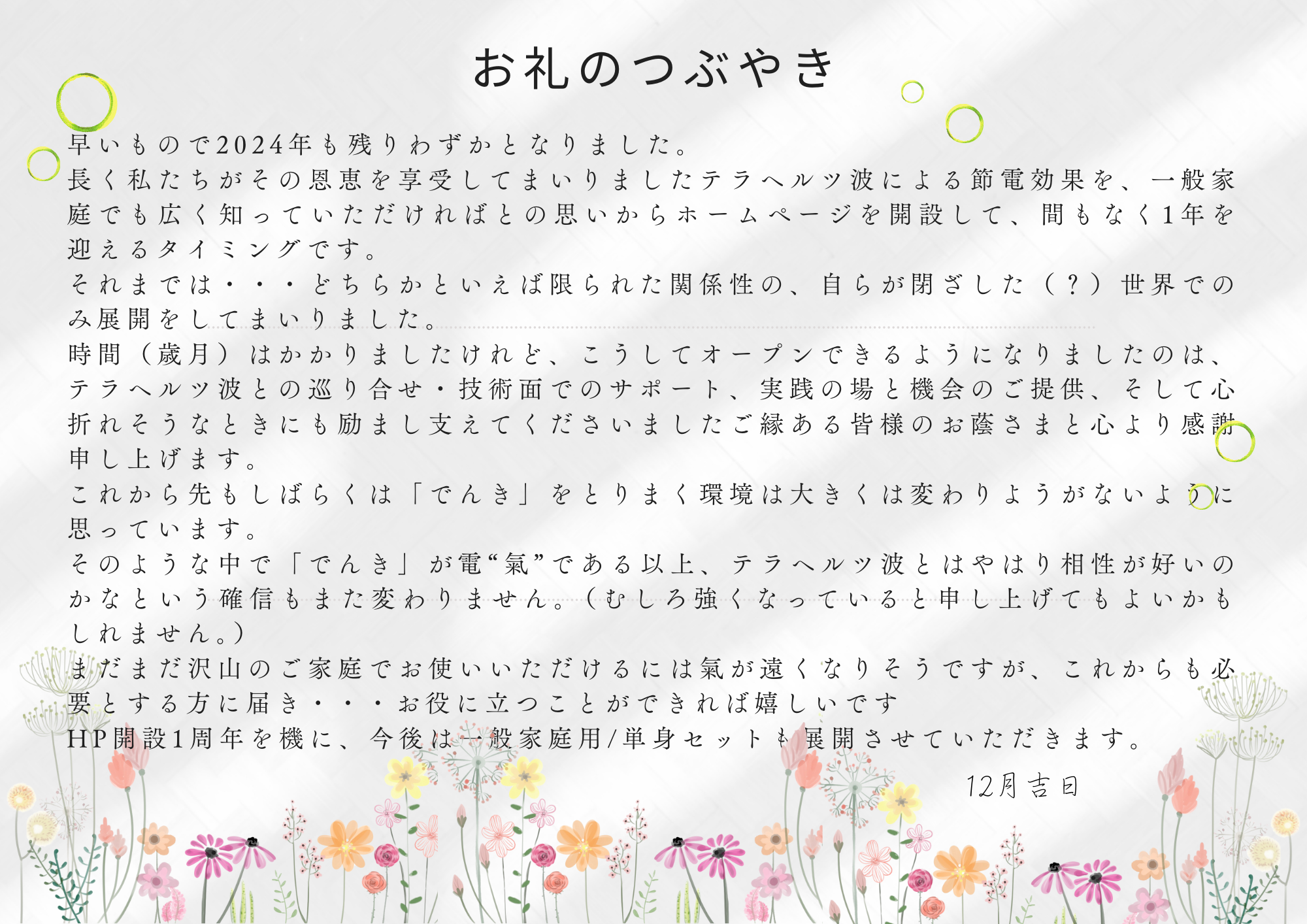 テラヘルツ波による節電効果を、一般家庭でも広く知っていただければとの思いからホームページを開設して、間もなく1年を迎えるタイミングです。それまでは・・・どちらかといえば限られた関係性の、自らが閉ざした(?)世界でのみ展開をしてまいりました。
